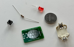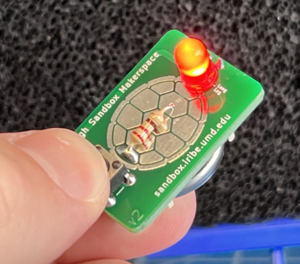 Congratulations! You've finished your first soldering project! Press the button, and the LED should light up!