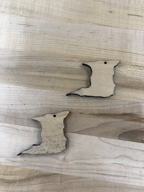 Found a PNG file of preferred image (in this case a country outline), used software to trace bitmap in order to print outline. Added a small circle near the top of the outline inside the border for metal pieces. Saved file as SVG file and uploaded to Glowforge app website. Printed. | Found a PNG file of preferred image (in this case a country outline), used software to trace bitmap in order to print outline. Added a small circle near the top of the outline inside the border for metal pieces. Saved file as SVG file and uploaded to Glowforge app website. Printed. |